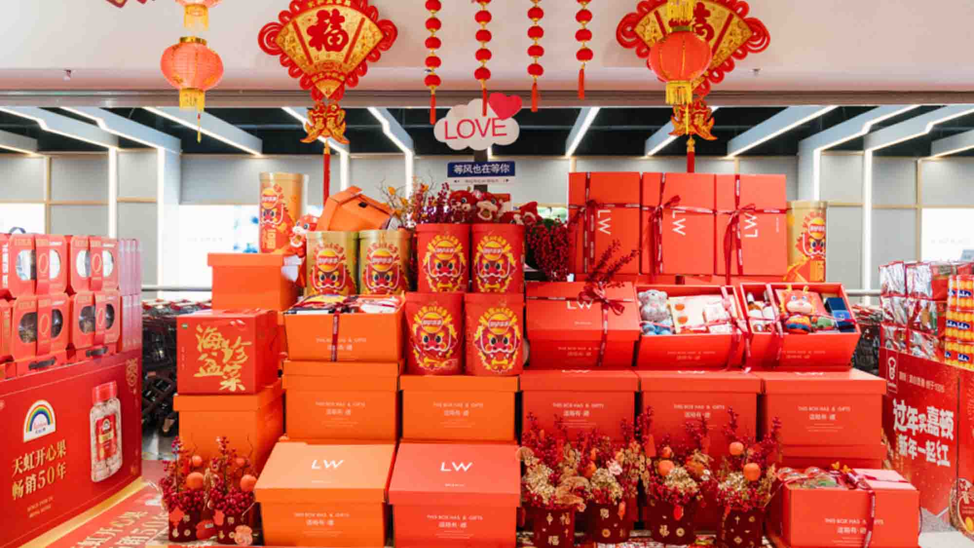 超市的货架陈列也进行了精心的设计,不仅呈现出整洁美观的效果,还营造出了浓厚的春节氛围。货架上除了琳琅满目的商品外,还展示了商品科普、生鲜做法、调料搭配等信息,让购物变得更有趣、更好玩。